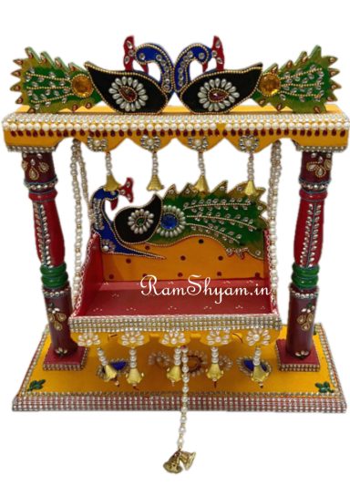 Wooden Jhoola Beautifully Decorated with Peacock design Pooja Purpose