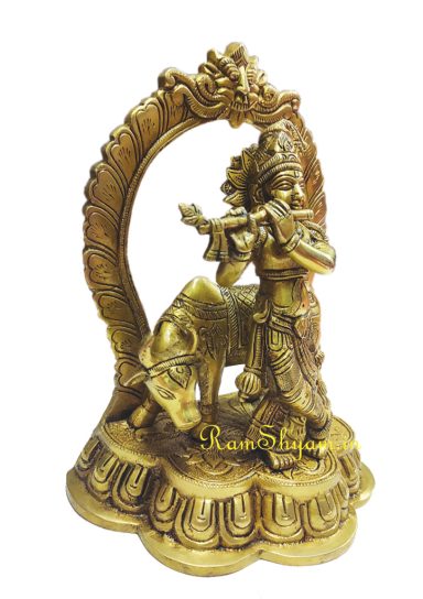 Brass Metal Standing Lord Krishna Statue with Flute and Cow Heavy Quality